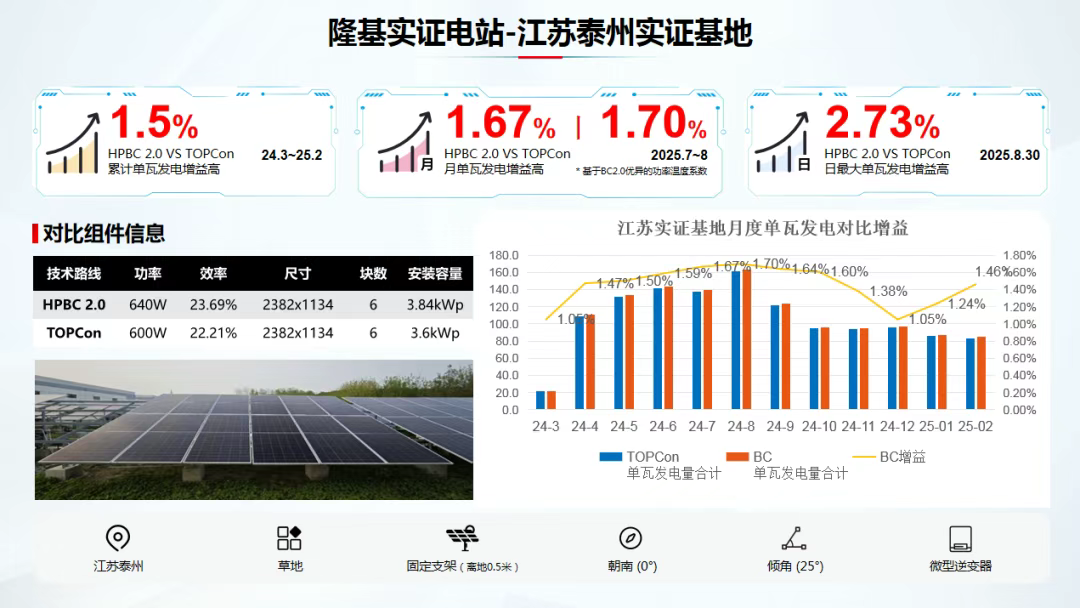 隆基泰州基地的实证电站一年数据显示,Hi-MO X10组件比TOPCon累计单瓦发电增益高1.5%,单日最大单瓦发电增益高2.73%。