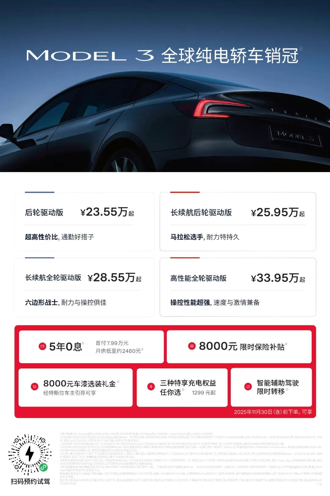 特斯拉Model 3 中国制造Model 3上市8年,全球热销300万辆,蝉联7年全球纯电轿车的销冠,全球平均每1.5分钟卖出一台,Model 3也是2025年上半年中国纯电中型车销冠。中国制造Model 3售价23.55万起,五年0利息,首付7.99万元,月供低至2460元,享受8000元保险补贴后价格低至22.75万元,经老车主引荐还可享8000元车漆选装礼金,1299元起的特享充电桩权益任你选。
