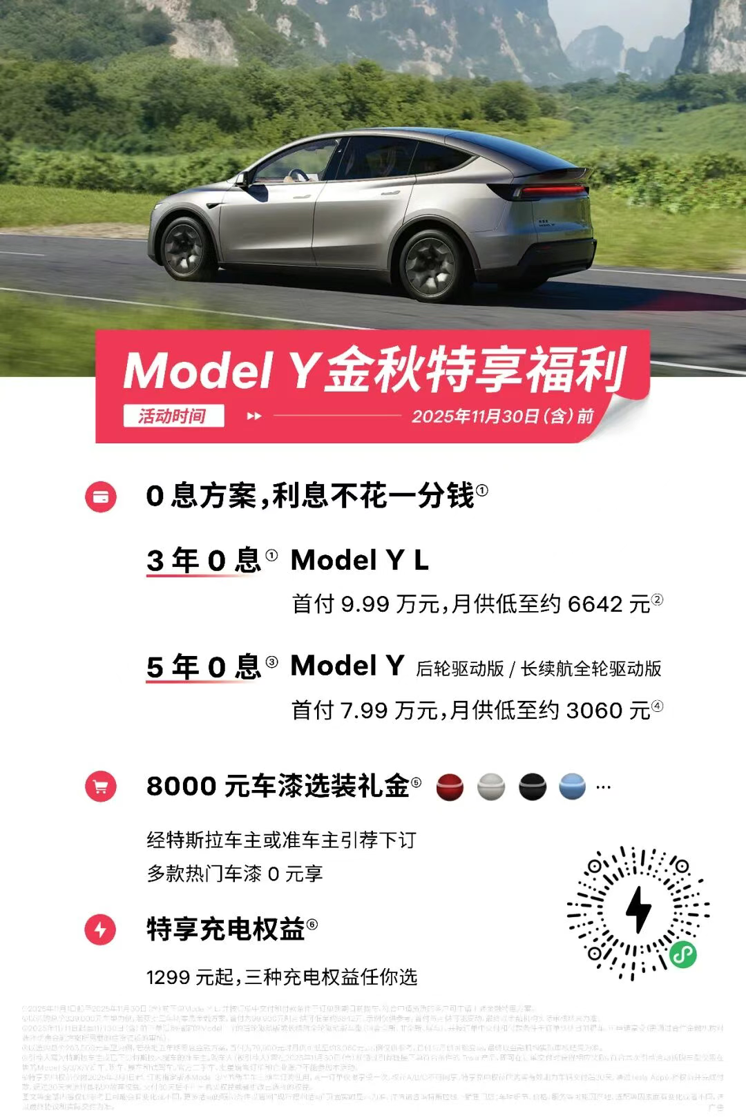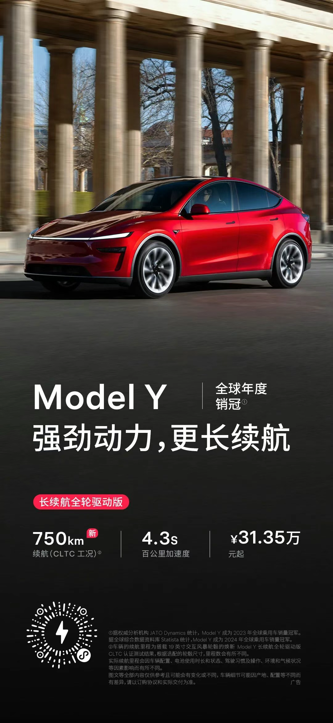 中国制造Model Y是2023年、2024年全球范围内销量第一的车型,蝉联2年中国市场的年度车型汽车销量冠军。2025年2月,Model Y焕新出发、全新上市更好看、更好开、更舒适、更实用、更智能,中国制造Model Y售价26.35万起,首付7.99万元,可享五年0利息金融福利,月供低至3060元,轻松开上销冠车型,还有8000元车漆选装礼金等你拿,1299元起的特享充电桩权益任你选。