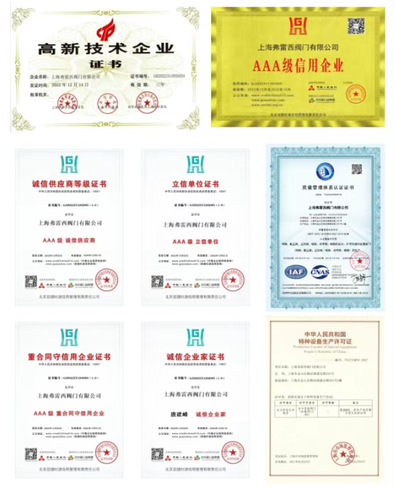 弗雷西阀门持有TS A1+A2生产许可。弗雷西阀门的球阀、蝶阀、调节阀、截止阀、闸阀、限位开关和电磁阀都取得了TUV安全完整性SIL认证。TUV防火认证覆盖了软密封球阀、硬密封球阀、偏心蝶阀、截止阀和调节阀。针对阀门填料处外漏,TUV莱茵的ISO 15848认证覆盖了球阀、截止阀和调节阀。