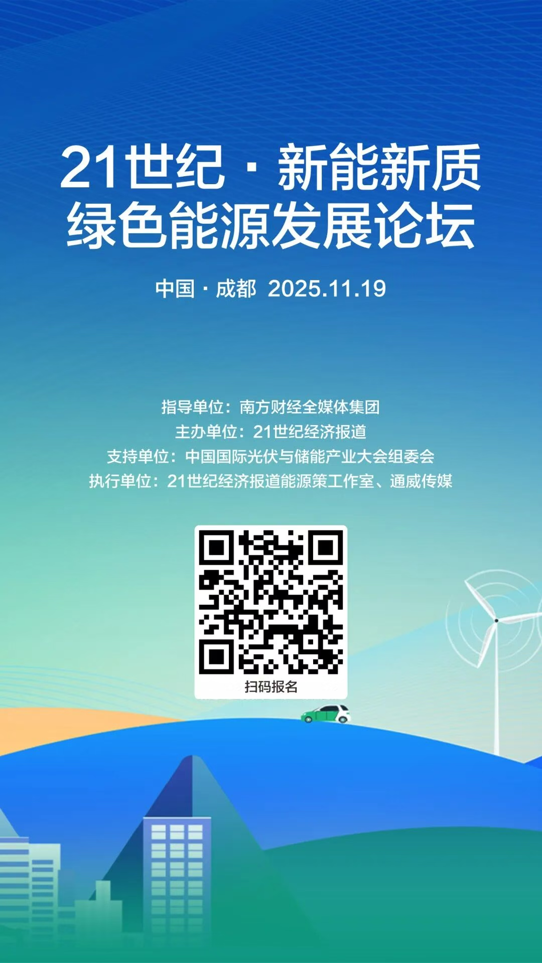 为进一步展示光储行业创新成果,促进光储行业国际交流合作,11月17-20日,2025第八届中国国际光伏与储能产业大会将于中国成都隆重举行。期间,2025年度“21世纪·新能新质”论坛将于11月19日下午隆重召开,本次论坛将聚焦“风光储氢电充”新能源、新材料、新装备产业链资源、技术、人才优势,寻求推动我国新能源领域高质量发展以及能源转型的优秀样本。