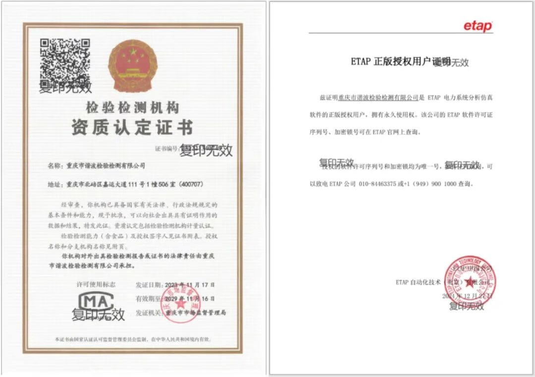 作为具备过硬资质的检测机构,公司已通过重庆市市场监督管理局计量认证(CMA资质),拿到带有法律效力的检测报告授权,报告可直接用于产品质量评价、成果及司法鉴定。同时,公司还通过ISO 9001:2015质量管理体系认证,并获得正版ETAP电力仿真授权,双重认证加持,让检测结果更具公信力。