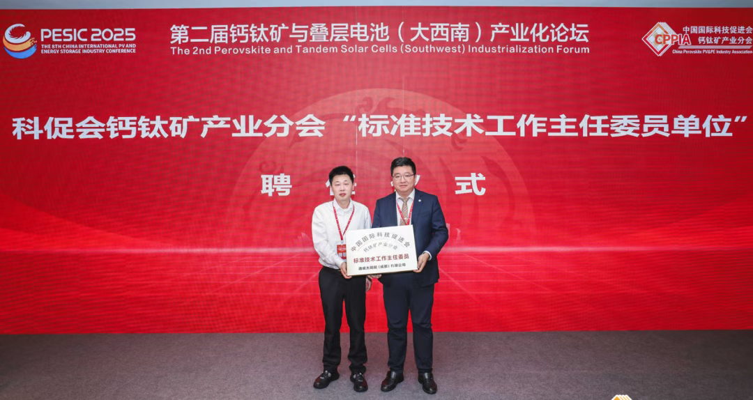 此次论坛开幕式期间,特别举办了中国国际科技促进会钙钛矿产业分会“标准技术工作主任委员单位”聘任仪式。分会聘任通威股份为最新委员单位,今后双方将携手推进钙钛矿产业标准体系建设,助力行业高质量发展。通威股份光伏技术中心部长龙巍作为受聘代表上台;山东能源集团中科光电有限公司董事长、科促会钙钛矿产业分会副会长姜京福作为聘任代表为其授牌。