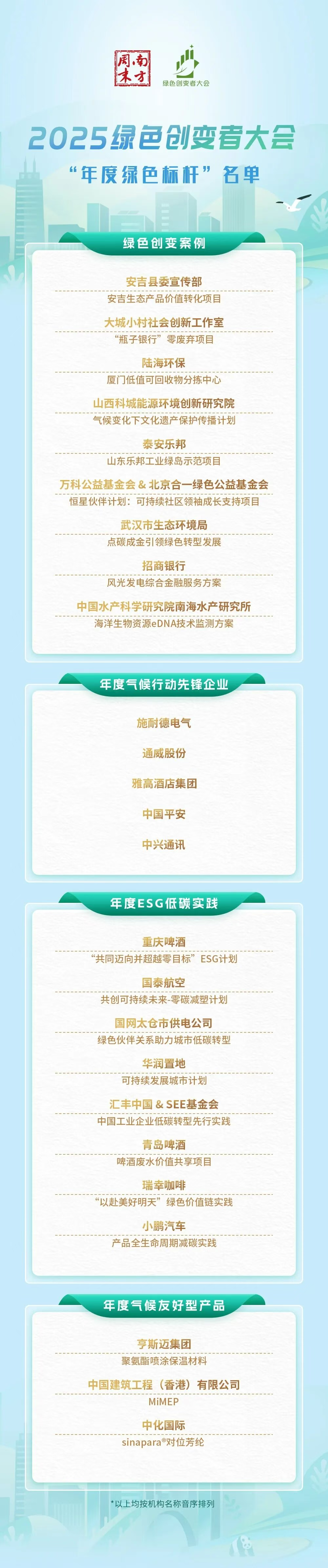 中国气象科学研究院研究员 国家气候变化专家委员会副主任翟盘茂 中国环境新闻工作者协会主席、生态环境部宣传教育司原司长、新闻发言人刘友宾以《开展美丽中国建设全民行动》为题,分享了倡导公众参与美丽中国建设的系统做法。 中国环境新闻工作者协会主席、生态环境部 宣传教育司原司长、新闻发言人刘友宾 无论气候治理的国际形势如何变化,中国绿色转型的决心不动摇,双碳行动依然坚定。在本次会议上,澳门国际碳排放权交易所总经理、南方周末中国企业社会责任研究中心智库专家孟萌以《规则重塑与市场融合:全球碳治理新格局下的中国创新》为题,介绍了全球碳市场发展现状和中国建立碳信用体系的创新做法。武汉市生态环境局党组书记、局长张朝辉以《点“碳”成“金”,领航绿色转型发展》为题,介绍武汉的低碳转型实践。 国际移民组织(IOM)气候变化与人口流动创新研究中心主任Bradley Mellicker也以《亚太地区的气候变化与人口流动》为题进行发言。 洞察企业进展,分享先锋实践 企业是绿色低碳转型行动的重要主体之一。2025年恰逢“两山”理论提出20周年、“双碳”目标提出5周年。在本次大会上,南方周末研究院发布了多项研究成果,观察企业在生态保护和双碳行动方面的进展情况。 南方周末编委、南方周末研究院副院长兼绿色研究中心主任曹海东以《值此青绿:“两山”理念20年践行观察》为题,清晰勾勒出“两山”理念二十年的实践图景。南方周末研究院副秘书长兼CSR研究中心主任孙孝文以《2025年南方周末企业双碳行动调研及观察》为题,详细介绍了过去一年工业、能源、建筑、交通、农食、金融等六大行业在低碳转型方面取得的成绩和存在的不足。 南方周末研究员黄思卓发布了“中国漂绿榜(2024-2025)”,基于媒体监督者的本色为“漂绿”的企业们敲响了警钟。南方周末研究员邹力发布了《中国企业参与生物多样性观察报告(2025)》,提出了中国企业保护生物多样性的八大观察和进一步应对挑战的对策。南方周末研究员李嘉诚发布了《趋势观察报告:户外品牌与消费者的可持续信息差(2025)》,指出了可持续商品与消费者之间存在的沟通错位。 此外,浙江工商大学会计学院教授、博士生导师黄溶冰解读了企业漂绿问题及其治理,北京市企业家环保基金会秘书长杨彪、大城小村社会创新工作室负责人李棣等学界和社会组织代表也分享了各自的观察研究。 低碳转型最终需要从理念落实到行动。在此次会议上,通威股份首席可持续发展官朱子涵、南网储能阳江蓄能发电公司生物多样性保护负责人郭占军、三夫户外总经理章超辉等企业代表围绕“双碳”治理、绿色创新、绿色消费等话题,分享了各自企业的探索实践。 值得一提的是,在本次绿色大会上,南方周末与中国环境新闻工作者协会正式达成了战略性合作;此外,未来南方周末将与国际移民组织达成更多合作。会上,2025“年度绿色标杆”名单正式发布。