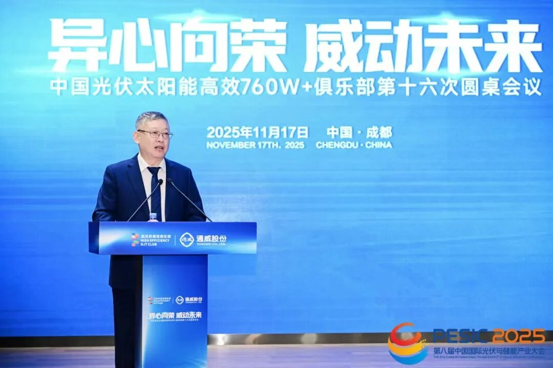 11月17日,中国光伏太阳能高效760W+俱乐部第十六次圆桌会议在四川成都成功举办。本次会议由通威股份有限公司担任轮值主席单位,安徽光势能、安徽华晟新能源、东方日升、广东明阳光伏、广东泉为科技、国电投新能源、国晟科技、金刚光伏、琏升光伏、润海光能、上海恒羲光伏、通威股份、中建材浚鑫、珠海鸿钧新能源(按中文首字母排序)等十四家俱乐部成员单位的主要领导及行业专家共同出席。迈为股份与SOLARZOOM作为特邀嘉宾参与本次圆桌交流。