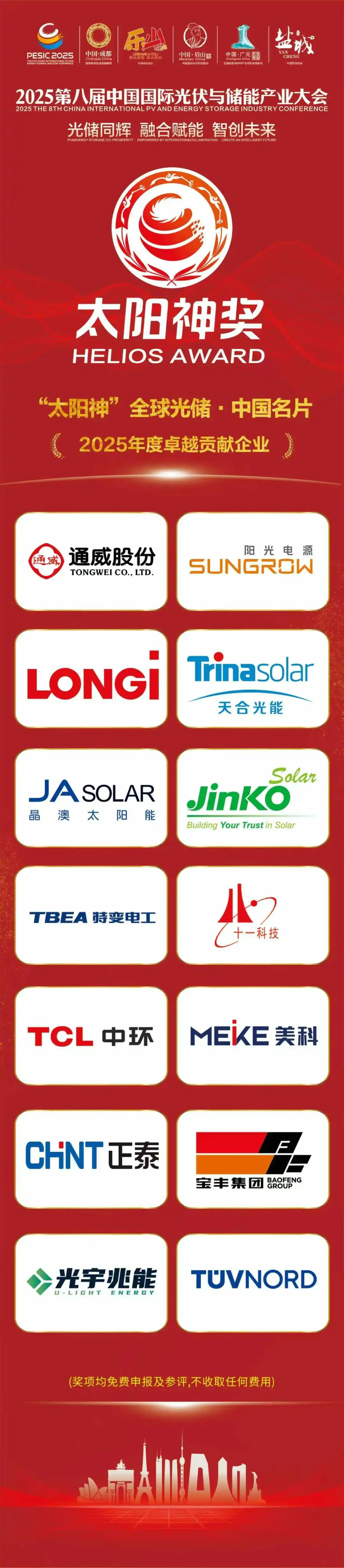 “太阳神”全球光储·中国名片系列奖项包括“年度卓越硅材料企业”“年度卓越辅材企业”“年度卓越电池企业”“年度卓越组件企业”“年度卓越储能企业”“年度卓越装备企业”“年度创新先锋企业”“年度卓越贡献企业”“年度卓越科研成果高校”“年度光储领袖人物”(免费申报及参评,不收取任何评审费用)。即日起,我们将陆续推出“太阳神”全球光储·中国名片系列奖项获奖名单,致敬中国光储企业和光储人的杰出贡献。