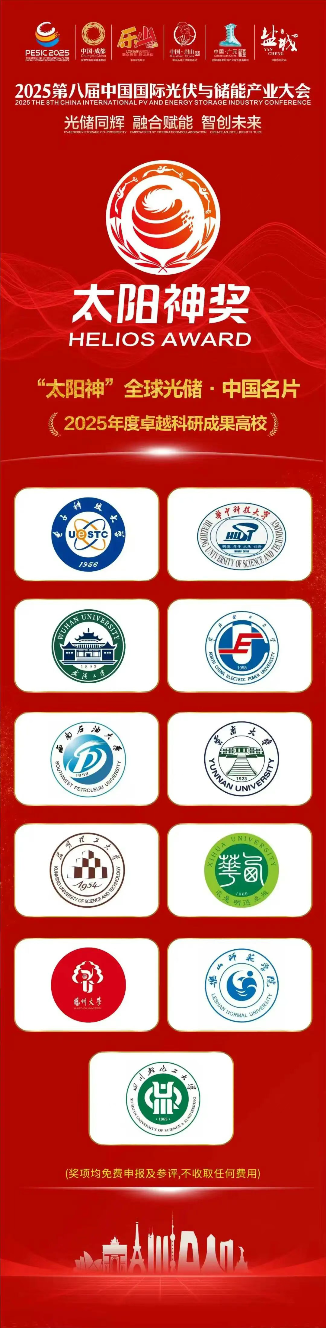 “太阳神”全球光储·中国名片系列奖项包括“年度卓越硅材料企业”“年度卓越辅材企业”“年度卓越电池企业”“年度卓越组件企业”“年度卓越储能企业”“年度卓越装备企业”“年度创新先锋企业”“年度卓越贡献企业”“年度卓越科研成果高校”“年度光储领袖人物”(免费申报及参评,不收取任何评审费用)。即日起,我们将陆续推出“太阳神”全球光储·中国名片系列奖项获奖名单,致敬中国光储企业和光储人的杰出贡献。