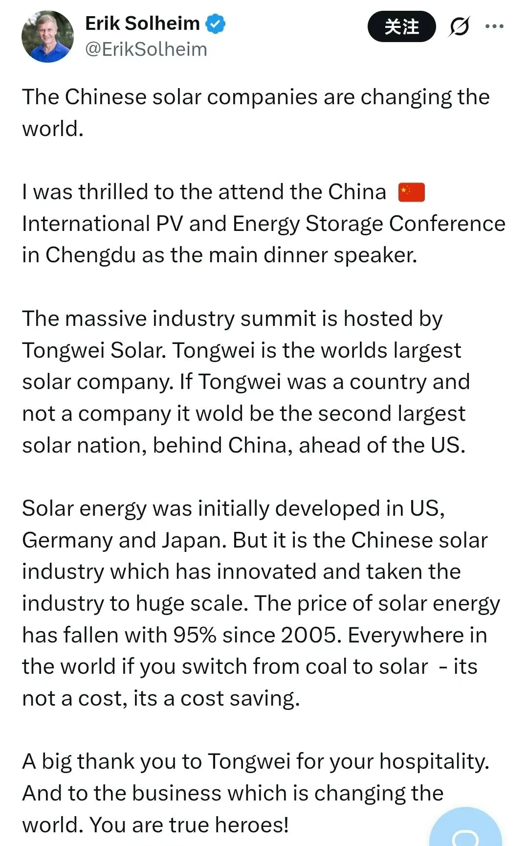 中国的太阳能企业正在改变世界。今天能作为主晚宴的演讲嘉宾,参加这场在成都举行的中国国际光伏与储能大会,我感到非常激动。太阳能最初发展于美国、德国和日本。但正是中国的太阳能产业通过创新,将该行业发展到了巨大的规模。自2005年以来,太阳能价格已下降了95%。在世界任何地方,如果你从煤炭转向太阳能,这不仅不会增加成本,反而会节省成本。非常感谢大会组委会的热情款待。也感谢像通威这样的光伏企业正在改变世界。你们是真正的英雄!