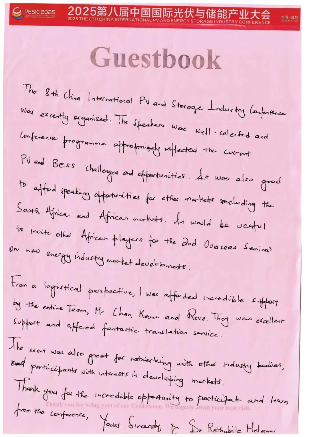 第八届中国国际光伏与储能产业大会的组织工作十分圆满。大会演讲嘉宾安排精当,议程内容精准契合当前光伏与储能领域所面临的挑战与机遇。特别值得一提的是,组委会为包括南非在内的非洲市场提供了发言机会,此举颇具意义。若未来能邀请更多非洲地区的代表参与第二届海外新能源产业市场发展研讨会,将更有助益。
