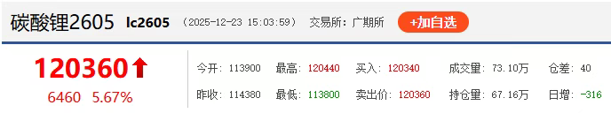 12月23日,碳酸锂期货价格突破12万元/吨关口,主力合约涨幅达5.67%。现货市场同步走强,电池级碳酸锂9.6-10.2万元/吨,均价9.9万元/吨;工业级碳酸锂9.47-9.80万元/吨,均价9.635万元/吨。