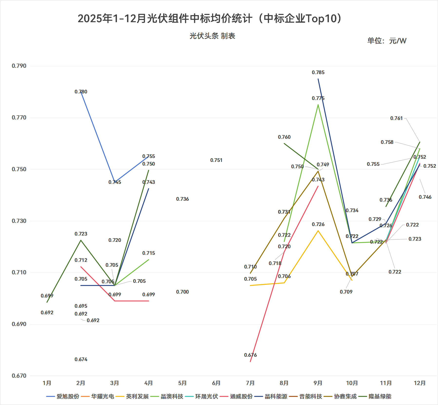 2025年约有542个光伏组件招标项目(标段)定标,合计容量约143GW。(注:包含2024年招标,最终在2025年定标的项目)中标企业方面,爱旭股份、通威股份、隆基绿能、协鑫集成、晋能科技、环晟光伏、晶澳科技、英利发展、华耀光电等223家企业或代理商中标。