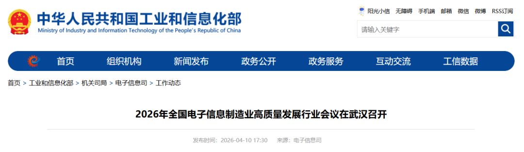 4月10日,工业和信息化部在湖北省武汉市召开2026年全国电子信息制造业高质量发展行业会议,深入学习贯彻习近平总书记关于电子信息产业发展的重要指示批示精神,系统总结“十四五”期间及2025年电子信息制造业发展成效,研究产业发展形势,部署下一阶段重点工作。工业和信息化部副部长熊继军出席会议并讲话。中国科学院院士祝宁华作主题报告。