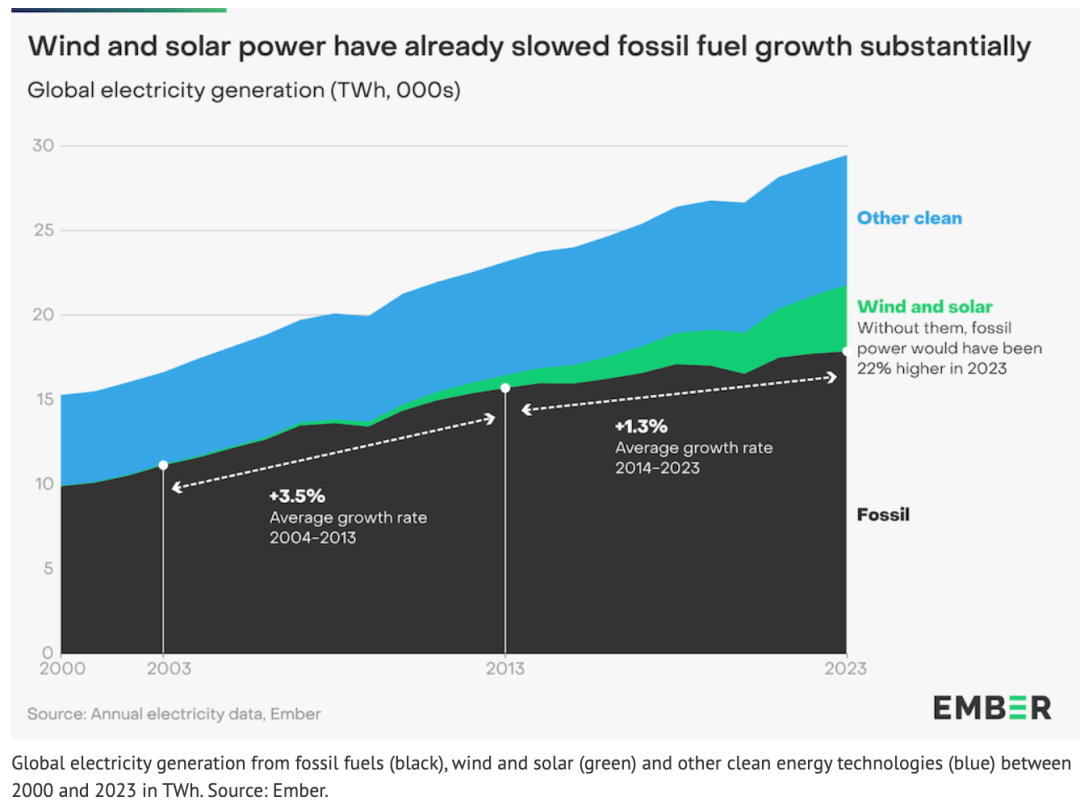 在全球范围内,风能和太阳能现在的增长速度已经足以超过不断增长的电力需求,这意味着从2024年起,全球化石燃料发电量和排放量将达到峰值。因此,化石燃料发电量下降的新时代即将到来。2023年可再生能源满足了创纪录的30%的全球电力需求,如果不是这一年水力发电的创纪录下降,2023年排放量可能已经达到峰值。风能和太阳能的崛起阻碍了化石燃料发电的增长,如果没有风能和太阳能,2023年化石燃料发电将增长22%,会使全球年排放量增加约40亿吨二氧化碳。