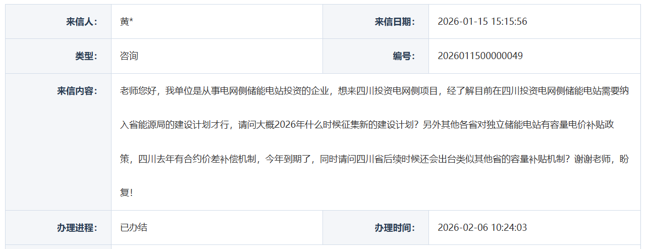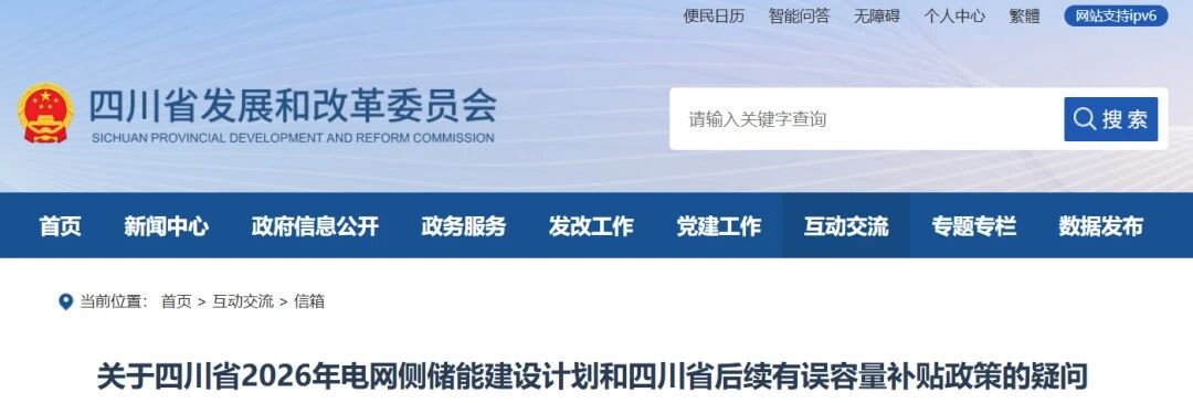储能与电力市场获悉,2月6日,四川省发改委就《关于四川省2026年电网侧储能建设计划和四川省后续有误容量补贴政策的疑问》进行答复。