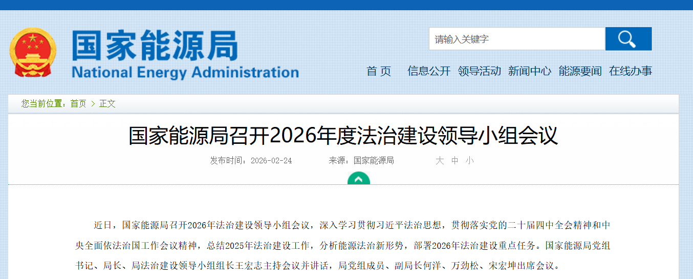 近日,国家能源局召开2026年法治建设领导小组会议,深入学习贯彻习近平法治思想,贯彻落实党的二十届四中全会精神和中央全面依法治国工作会议精神,总结2025年法治建设工作,分析能源法治新形势,部署2026年法治建设重点任务。国家能源局党组书记、局长、局法治建设领导小组组长王宏志主持会议并讲话,局党组成员、副局长何洋、万劲松、宋宏坤出席会议。