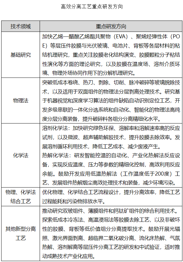 (二)突破高效分离工艺。开展光伏组件胶膜粘结机理研究,丰富完善胶膜低成本解离技术理论体系。加快研发晶硅单玻、双玻等组件的物理法、化学法、结合工艺及新型分离工艺,攻克光伏组件部件与胶膜的绿色、高效分离技术,鼓励开发非破坏性拆解技术,探索完整玻璃等材料获取路径。详见附件《高效分离工艺重点研发方向》。(工业和信息化部、生态环境部按职责分工负责)