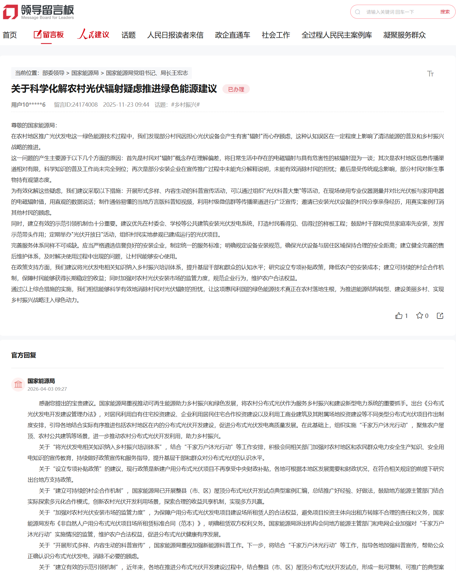 日前,人民网留言板有网友就乡村振兴话题留言《关于科学化解农村光伏辐射疑虑推进绿色能源建议》,针对农村地区分布式光伏“有辐射”而导致推进就困难进行了相关建议。