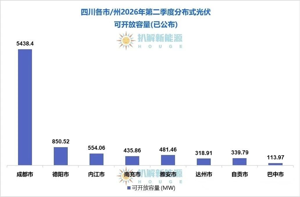 据扒解新能源统计,截至2026年4月18日,四川省已有8个市(州)公开发布2026年第二季度分布式光伏可开放容量及承载能力评估等级,分别是:成都市、德阳市、内江市、南充市、雅安市、达州市、自贡市、巴中市。从已公布的数据来看,成都市2026年第二季度分布式光伏可开放容量最多,为5438.4MW。