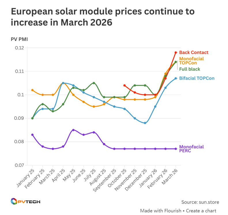 近日,根据最新发布的pv.index报告显示,所监测的大多数组件技术价格环比上涨4%至6%,其中背接触(BC)组件价格涨幅甚至高达10%,为所有技术中涨幅最大。sun.store补充道,高端设计组件以及更高的效率推动了所有技术类型的价格上涨,TOPCon组件的交易价格远高于2025年年中水平,这既反映了市场接受度的不断提高,也体现了持续的技术变革。